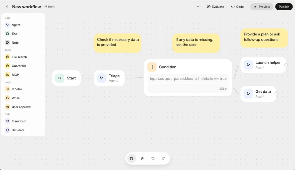 AgentKitは、プログラミングコードを書かずにAIエージェントの動作を設計できる「Agent Builder」というツールを提供します。これは、画面上で部品をドラッグ&ドロップし、線でつなぐことでAIの動作(ワークフロー)を視覚的に組み立てられる仕組みです。
