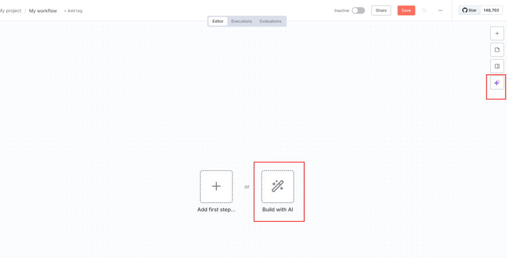テキストで目的と入出力を書くだけで、AIが必要ノードの選定と接続を自動化します。キャンバスでBuild with AIを起動し、日本語で「いつ・どこで・何を」を明確に入力します。