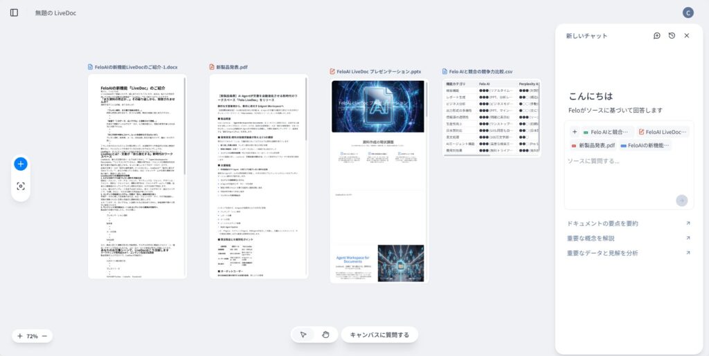 ビジネスの現場では、PDFやWord、Excelなど様々な形式のファイルが混在しがちです。Felo LiveDocは、そうした多様なファイル形式の処理に対応しており、ファイルごとにツールを使い分ける手間を根本から解決します。