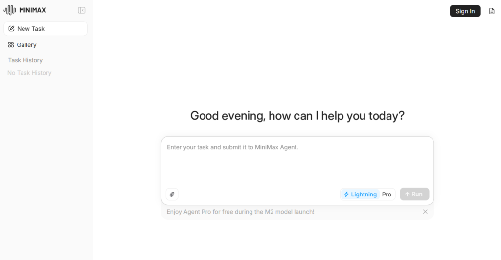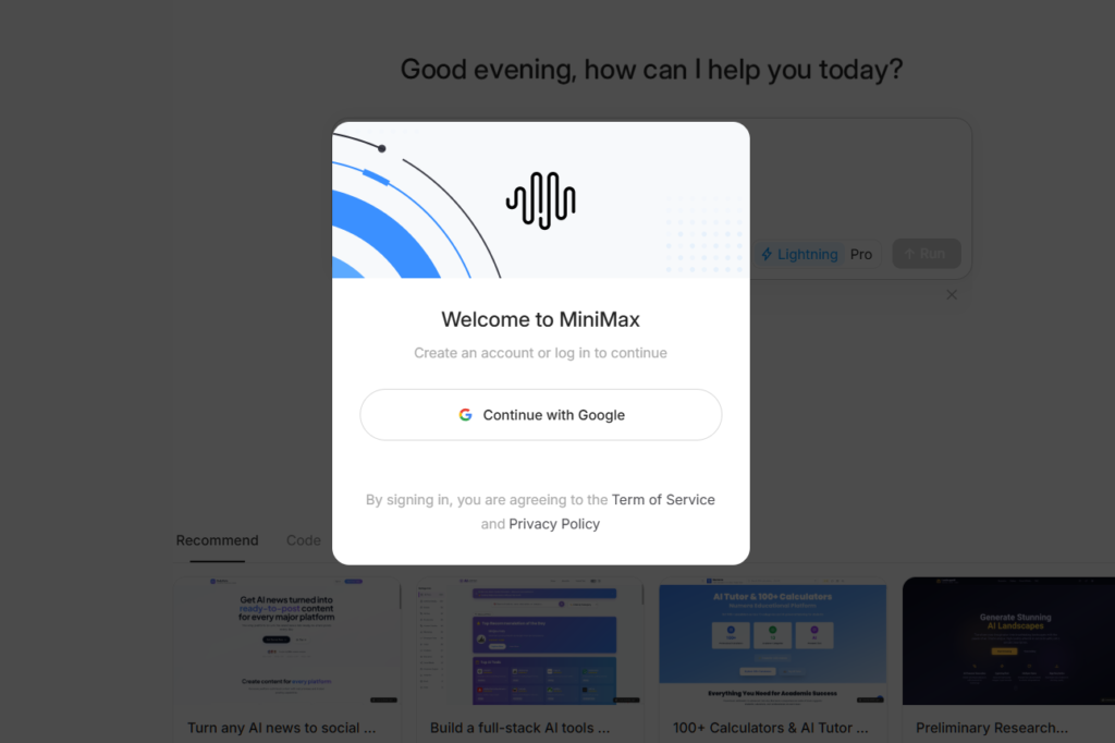 MiniMax Agentを始めるのに、複雑な手続きは必要ありません。まずは公式サイトにアクセスし、普段お使いのGoogleアカウントでサインインするだけで、すぐに利用を開始できます。面倒な個人情報の入力もありません。