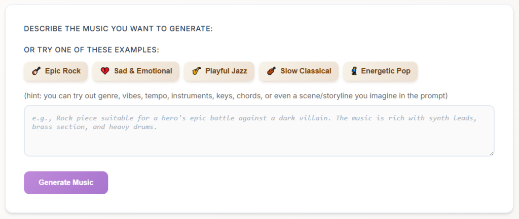 MIDI-LLMの大きな魅力は、その高度な技術を誰でも気軽に体験できる無料デモが公開されている点です。専門家でなくても、ほんの数分でAIによる音楽生成の世界に触れ、自分のビジネスにどう活用できるかのヒントを得られます。