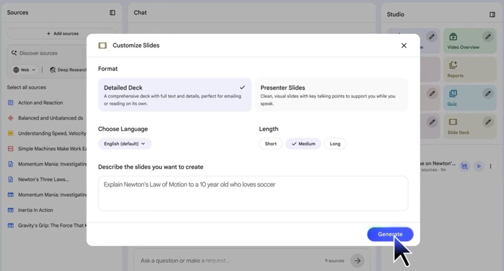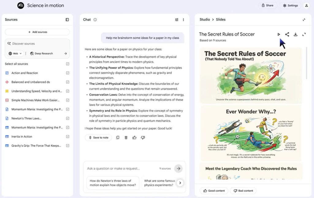 NotebookLMの無料プランは、Googleアカウントさえあれば誰でもすぐに使い始められる点が魅力です。スライド自動生成機能も無料プランで利用可能であり、今後数週間以内に全ての無料ユーザーに段階的に展開される予定となっています。