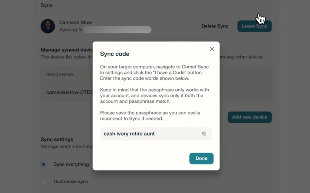 When syncing is turned on, Comet generates a unique sync code specifically for your account. Choose to sync everything, or customize the information that is shared across your devices. pic.twitter.com/M1BJlA4Tuq