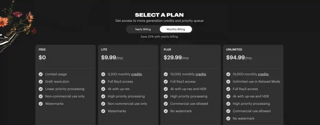Luma AIには誰でも始められるFreeプランが用意されており、月30回程度の生成枠と標準優先度の処理が提供されています。ただし、基本的には非商用利用が前提で、出力にはウォーターマークが入り、生成内容も公開扱いになるなど、ビジネス利用には制限があります。