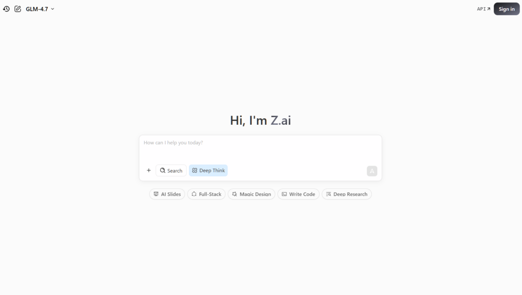 Z.ai公式サイトにアクセスし、無料アカウントを作成するところから始めましょう。ログイン後、画面上部のモデル選択メニューで「GLM-4.7」を選べば、すぐに利用を開始できます。