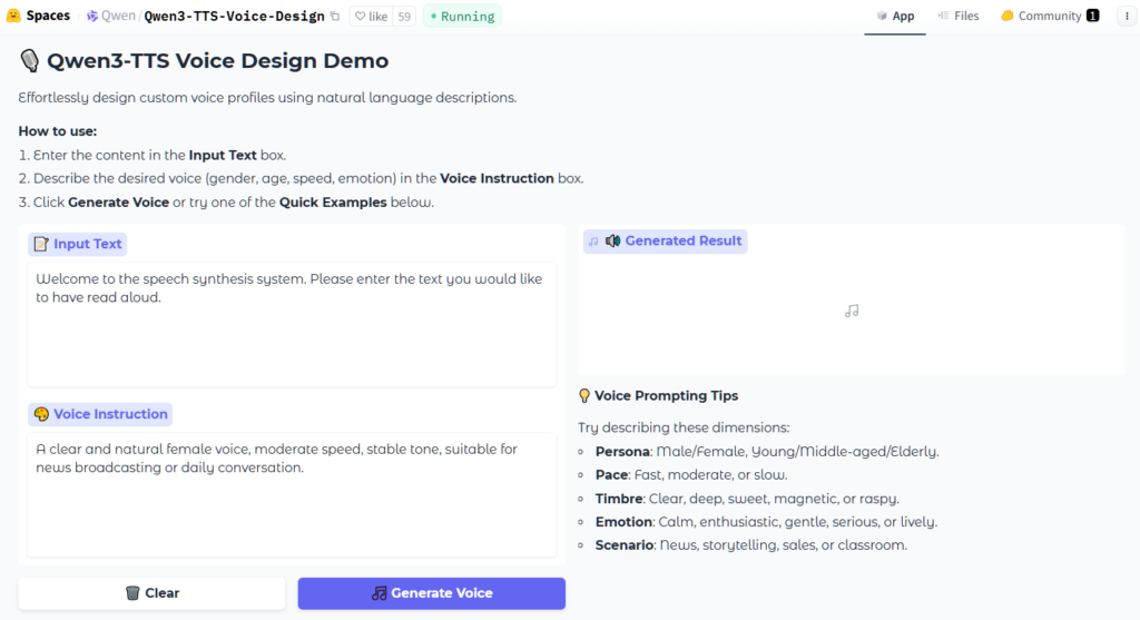 Qwen3-TTSは、17種類の音声プリセットから選べるだけでなく、自分だけのオリジナルボイスを設計できる点が大きな魅力です。従来のロボットっぽい声とは異なり、人間らしい抑揚と感情表現を実現しています。
