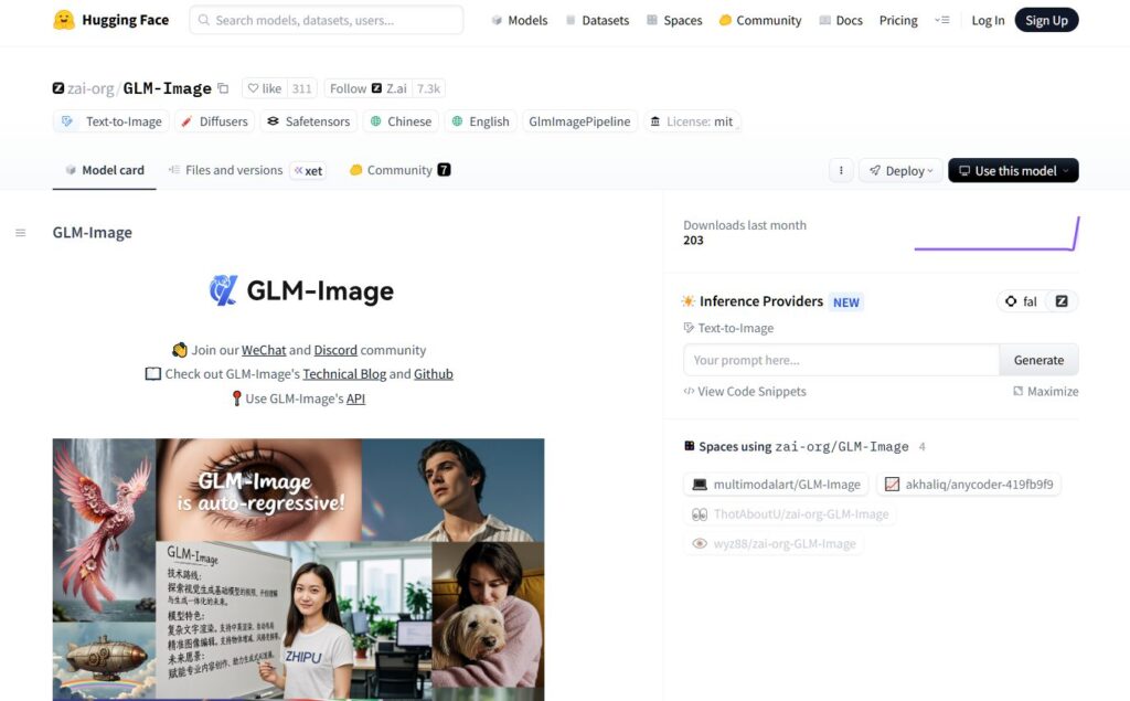 GLM-Imageを試すには、まずHugging Faceにアクセスし、検索バーで「GLM-Image Zhipu」と入力してください。アカウント登録なしでも基本操作が可能ですが、無料アカウントを作成すると生成回数が増え、画像の保存や共有がしやすくなります。