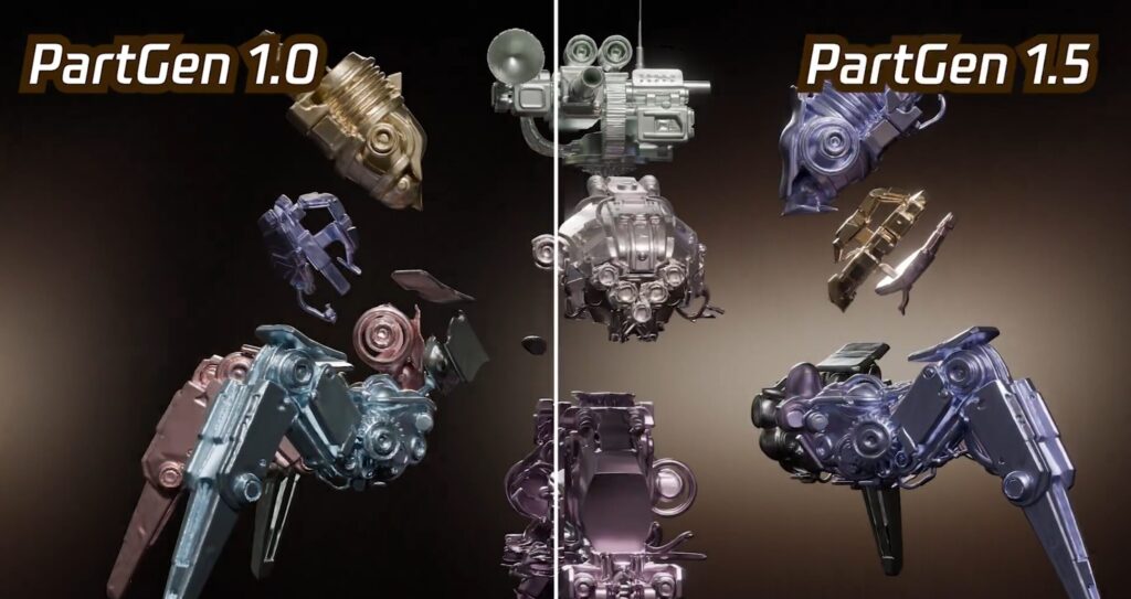PartGen 1.5は、3Dモデルを細かいパーツに自動で分割する機能です。解像度の向上とブラシ編集により、商品の部品ごとの表示や分解図作成が手軽に行えます。