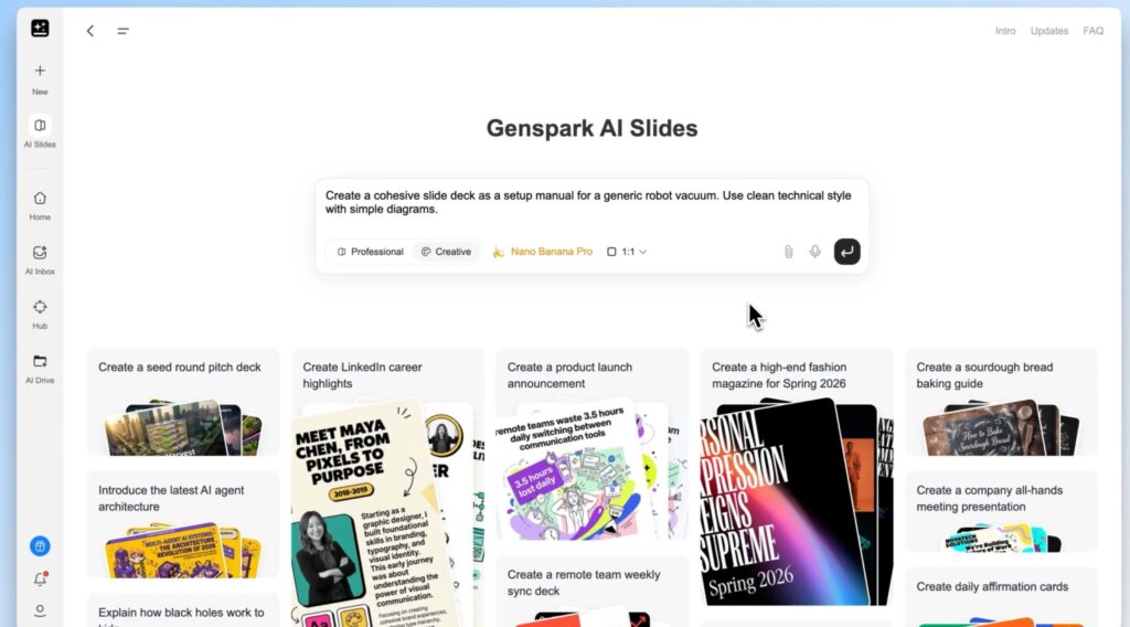 GensparkのAI Slidesに搭載されたCreative Modeは、テキスト入力からストーリー性のあるスライドを自動生成する新機能です。Nano Banana Proとの連携により、高品質なビジュアル資料を短時間で作成できます。