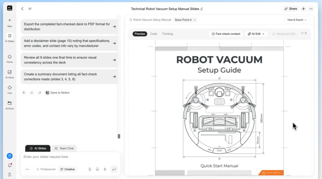 Creative Modeは、導入部から問題提起、解決策、まとめまでの構成を自動で組み立て、各ページにNano Banana Proが高品質なビジュアルを生成してくれます。デザインソフトの知識がなくても、プロ級の提案資料を数分で完成させられるのが特徴です。