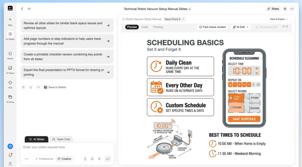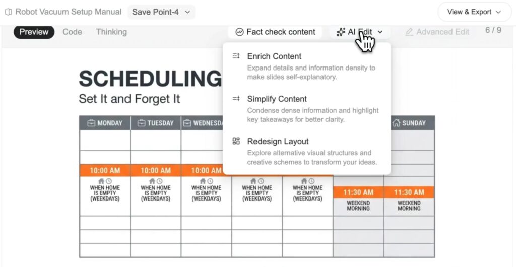 生成後は「Mark to Edit」で部分修正したり、「Redesign Layout」で全体のレイアウトを変更したりと、直感的な操作で微調整が可能となっています。初心者でもプロ級の提案資料を短時間で完成させられるのが、このモードの強みといえるでしょう。