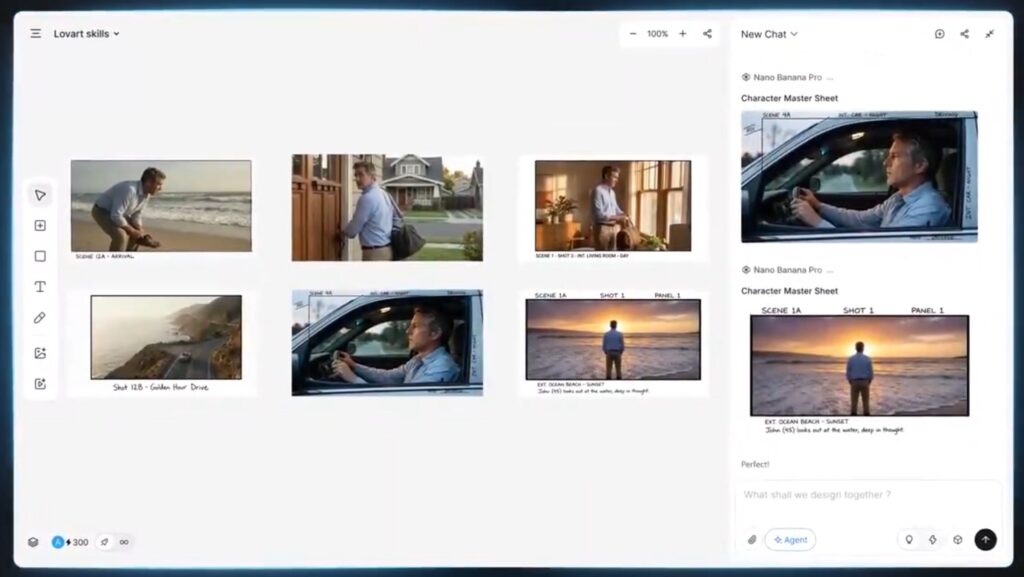 Lovart Skillsは、AIエージェントがシニアデザイナーの思考プロセスを再現し、ロゴ・カラー・フォントを一貫したシステムとして生成してくれる点が特徴です。ストーリーボード機能を使えば、動画企画も素早く進められます。