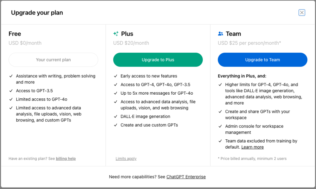 - Teamは1人あたり月額約25〜30ドルで管理機能や共有ワークスペースが使えるチーム向けプラン